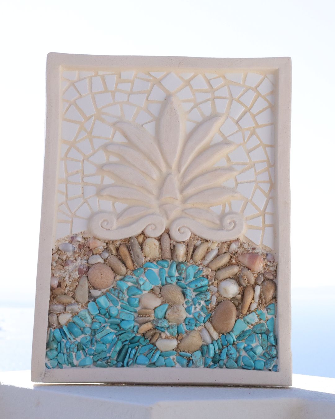 This mosaic by Marinella features a crafted anthemion motif made from handmade clay pieces, set against a white tile background. Below the anthemion, a dynamic wave meander pattern is composed of two different types of pebbles, creating a textured and vibrant contrast. Created on a durable ceramic base, this mosaic combines traditional Mediterranean symbolism with natural materials, showcasing Marinella’s love of culture and artistic inspiration. It is a perfect decorative piece for adding timeless elegance and tactile beauty to any space.