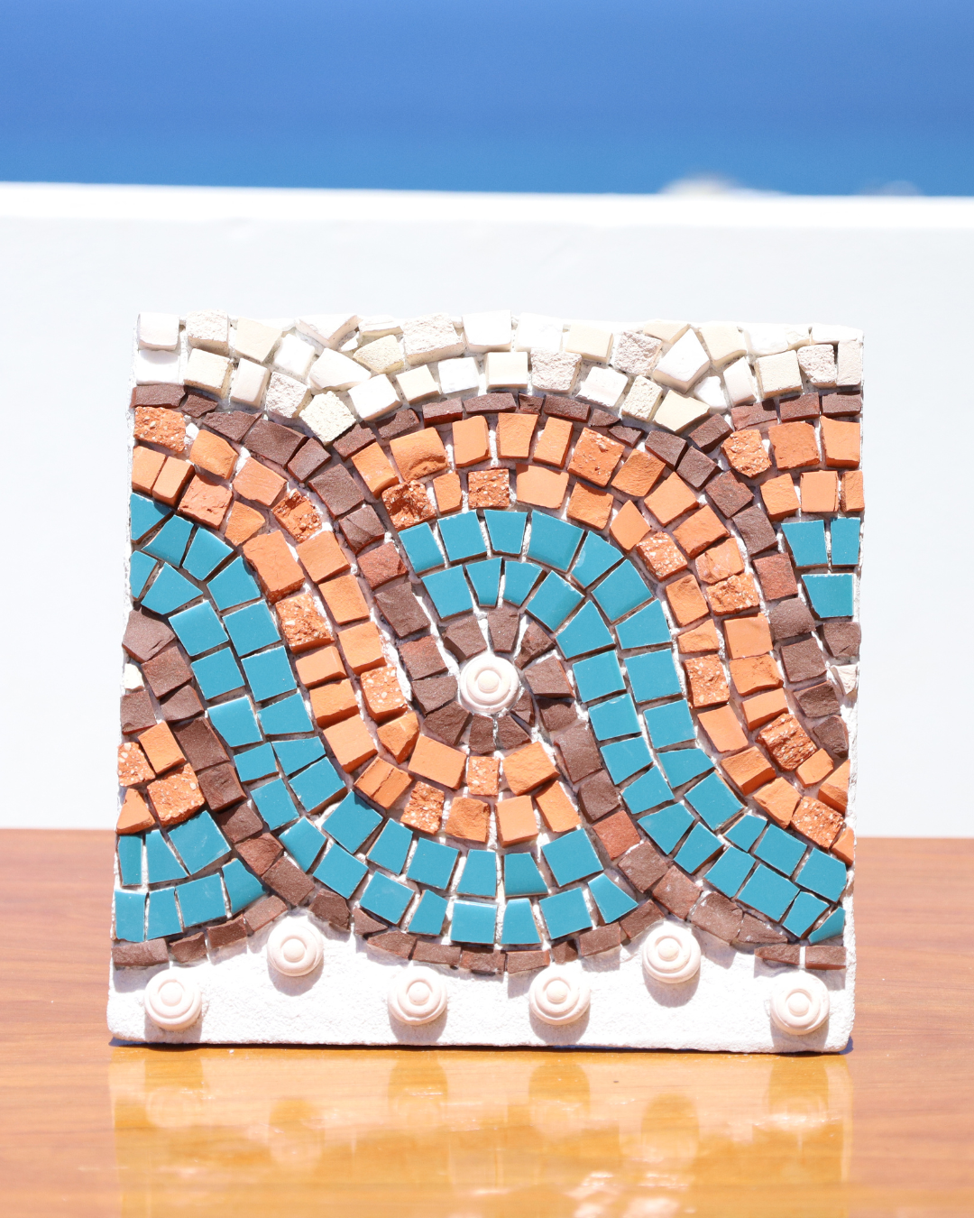 This handcrafted bicolor meander mosaic by Marinella is created on a ceramic base and features a vibrant interplay of mosaic tiles, handmade mosaic tiles, and natural rock-based materials. The design is inspired by the rich colors of Crete, combining earthy terracotta and warm browns with striking turquoise blues. The flowing meander pattern evokes a sense of movement and tradition, while the textured materials add depth and character to the piece. Perfect as a decorative accent, this mosaic brings a touch of Mediterranean heritage and artisanal craftsmanship to any space.