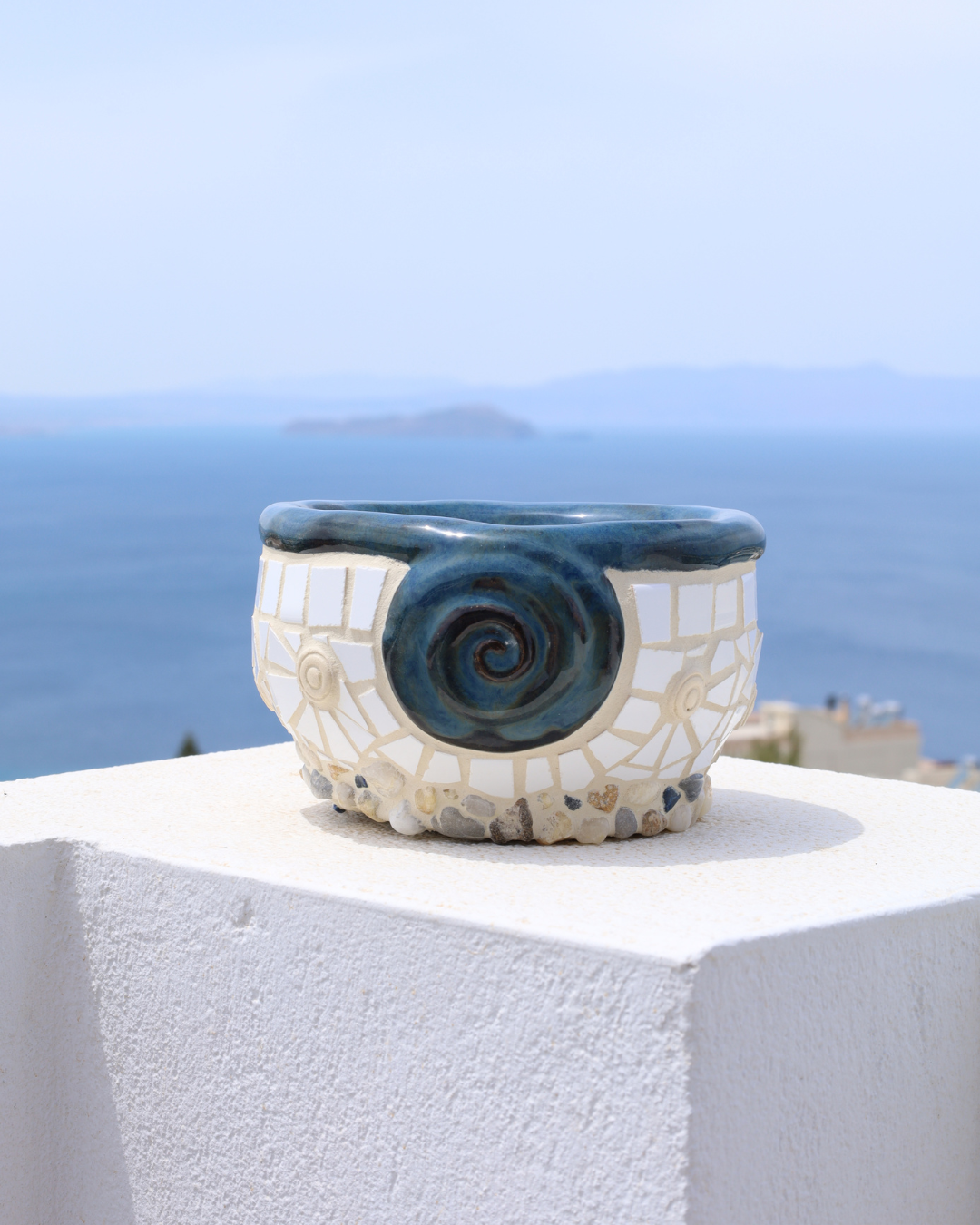 This beautifully handbuilt ceramic vase features a glossy blue glazed rim that elegantly frames a mosaic body composed of both ceramic and handmade tiles. The intricate mosaic design is complemented by natural pebbles adorning the base, adding texture and an organic feel to the piece.