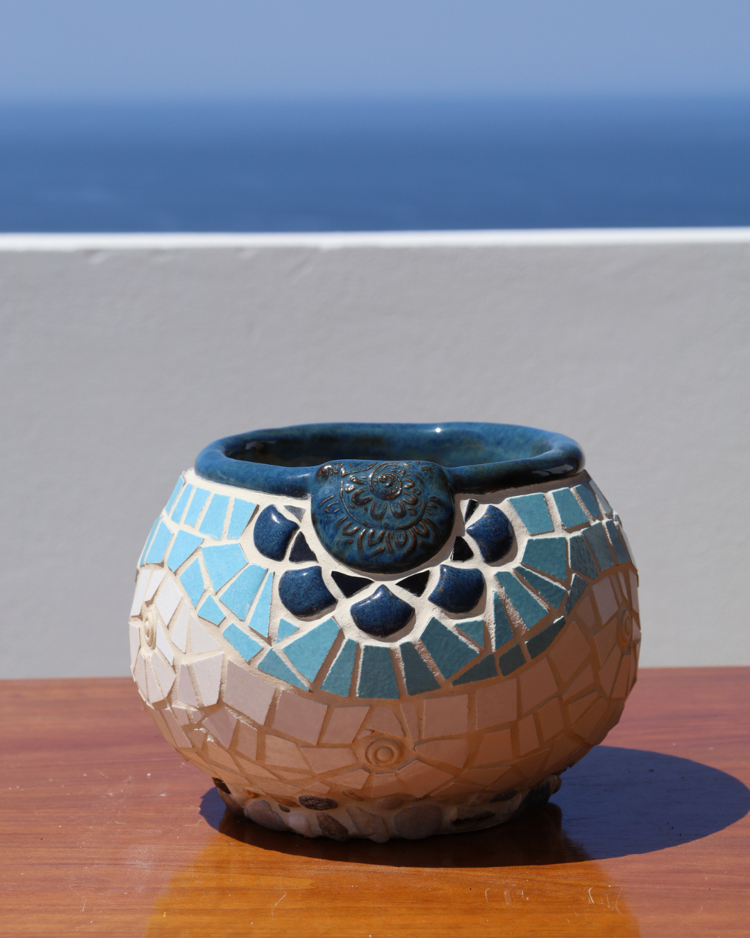 - Mosaic body made of ceramic and handmade tiles in blue and cream tones