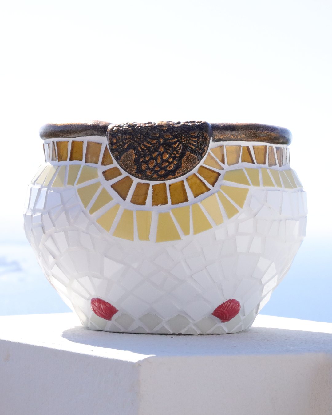 This exquisite handbuilt ceramic vase features a rich bronze-glazed rim with intricate textured detailing, lending an elegant and timeless touch. The mosaic body is crafted from a harmonious blend of glass tiles, ceramic tiles, and striking red handmade ceramic tile accents that add vibrant pops of color. The design balances warm golden hues with crisp white tiles, creating a visually captivating piece.