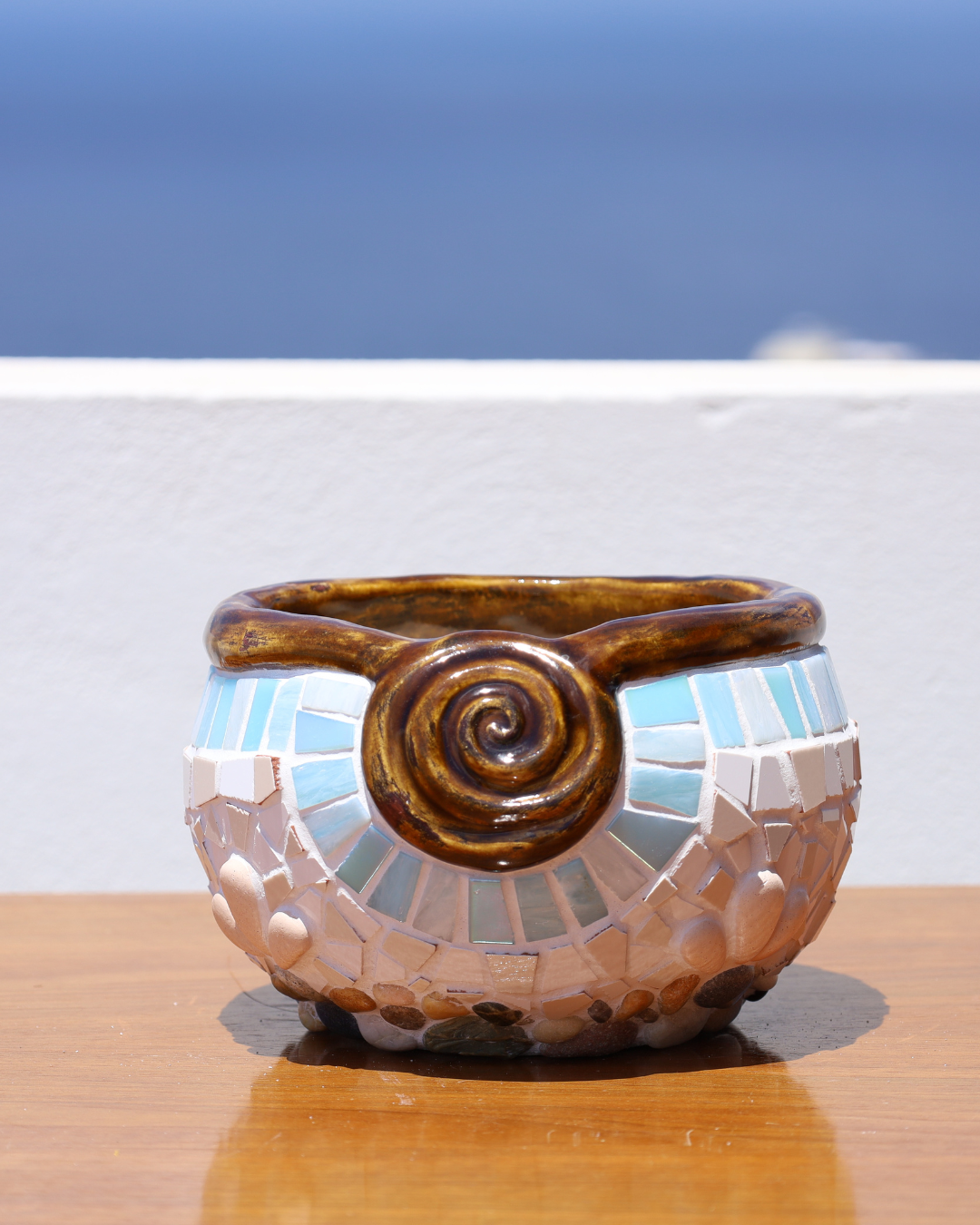 - Handbuilt ceramic base with bronze-glazed rim and spiral detail